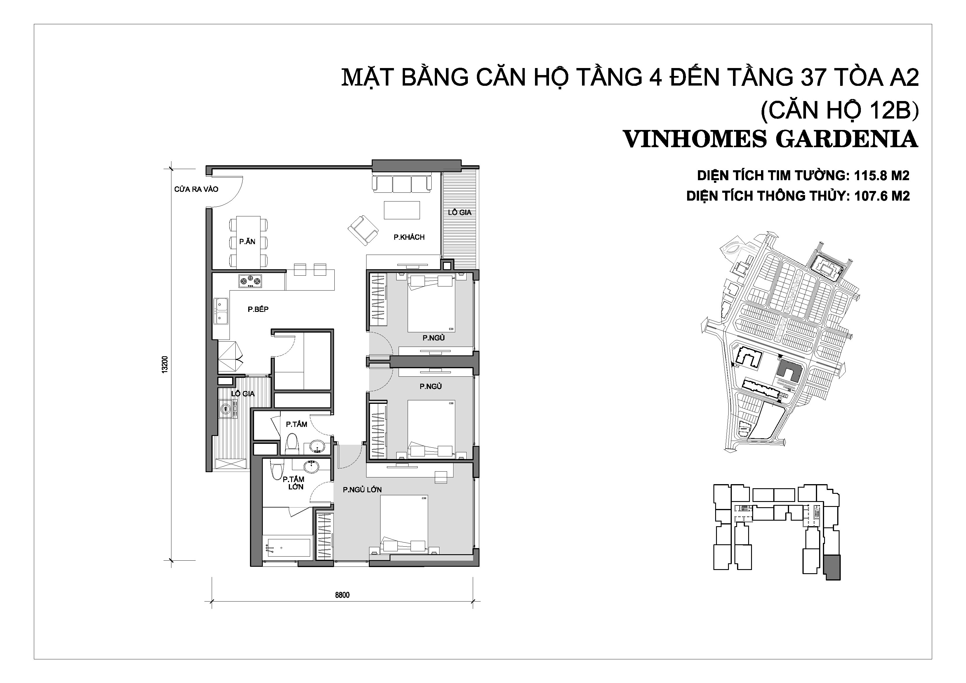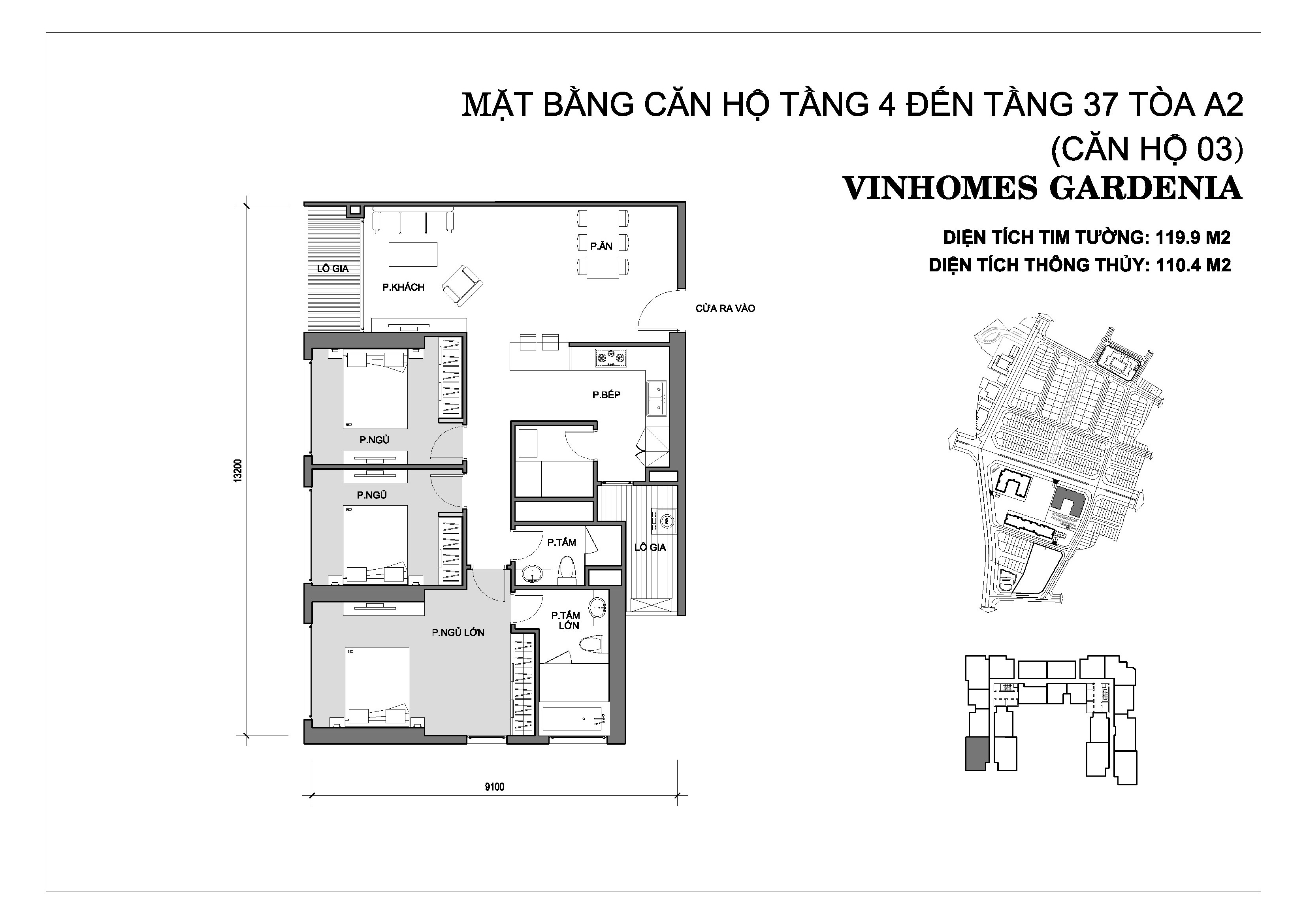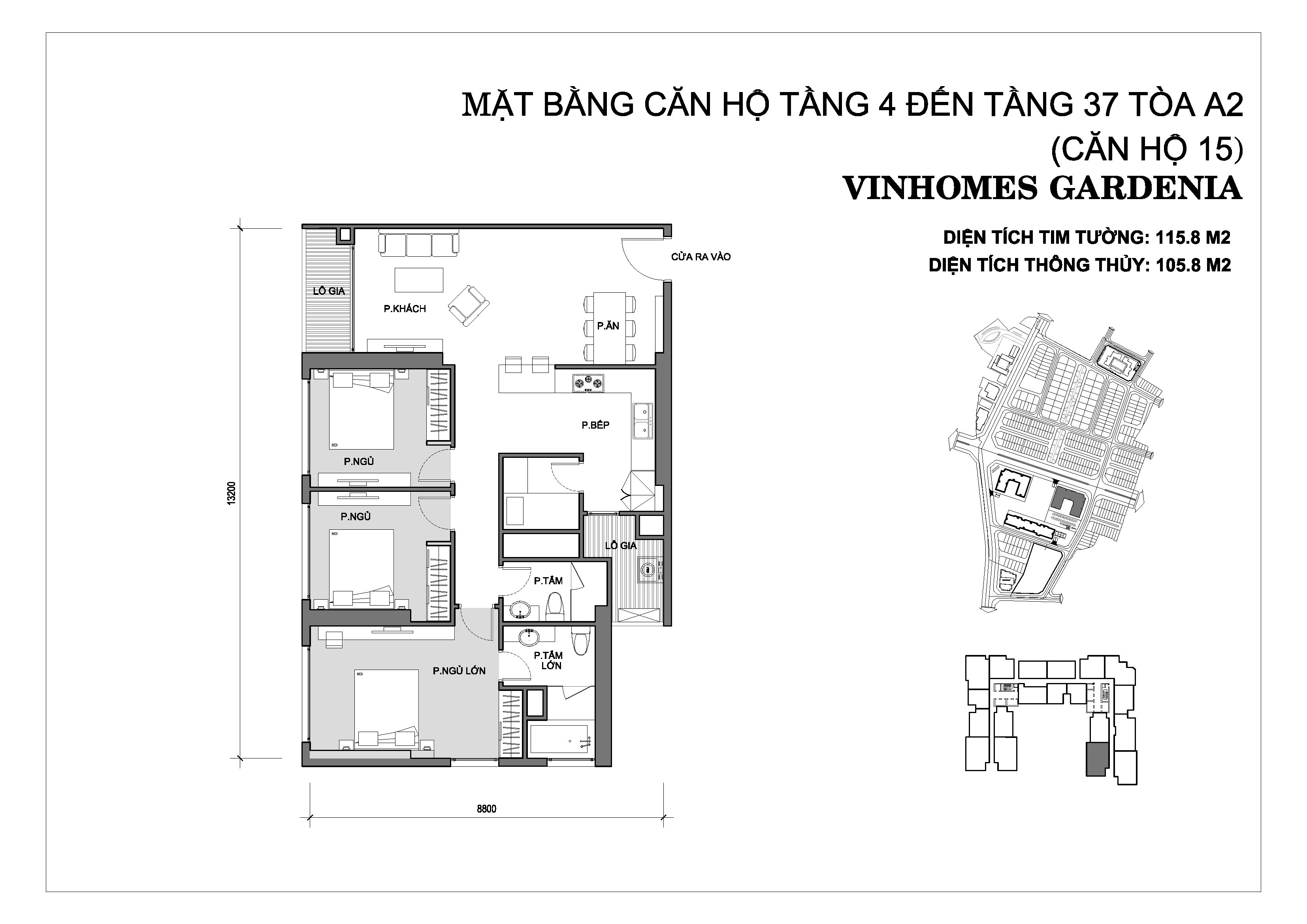 Căn hộ 3 phòng ngủ: 5 căn, diện tích từ 104,8 m2 – đến 123,7 m2, Tổng có 185 căn hộ.